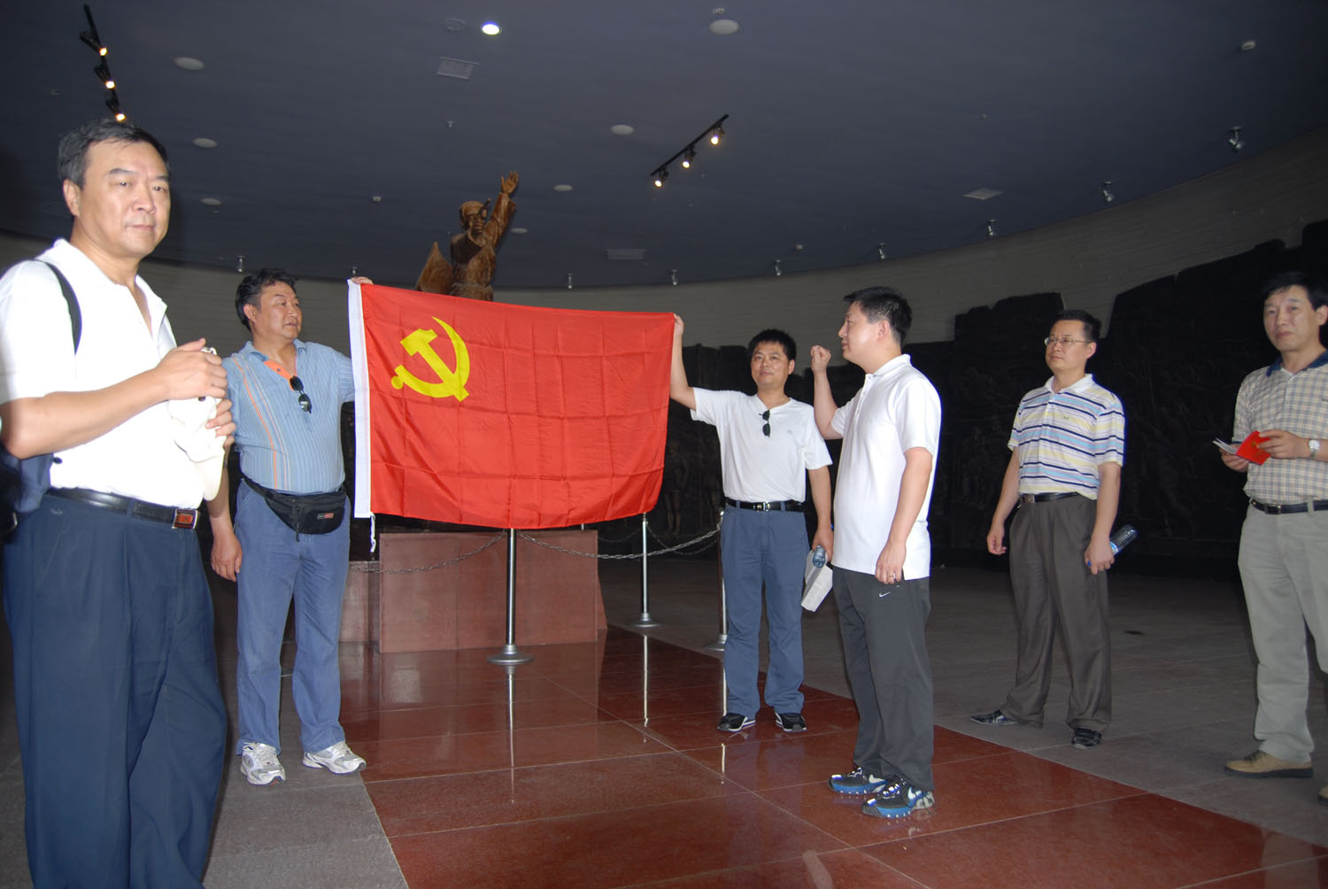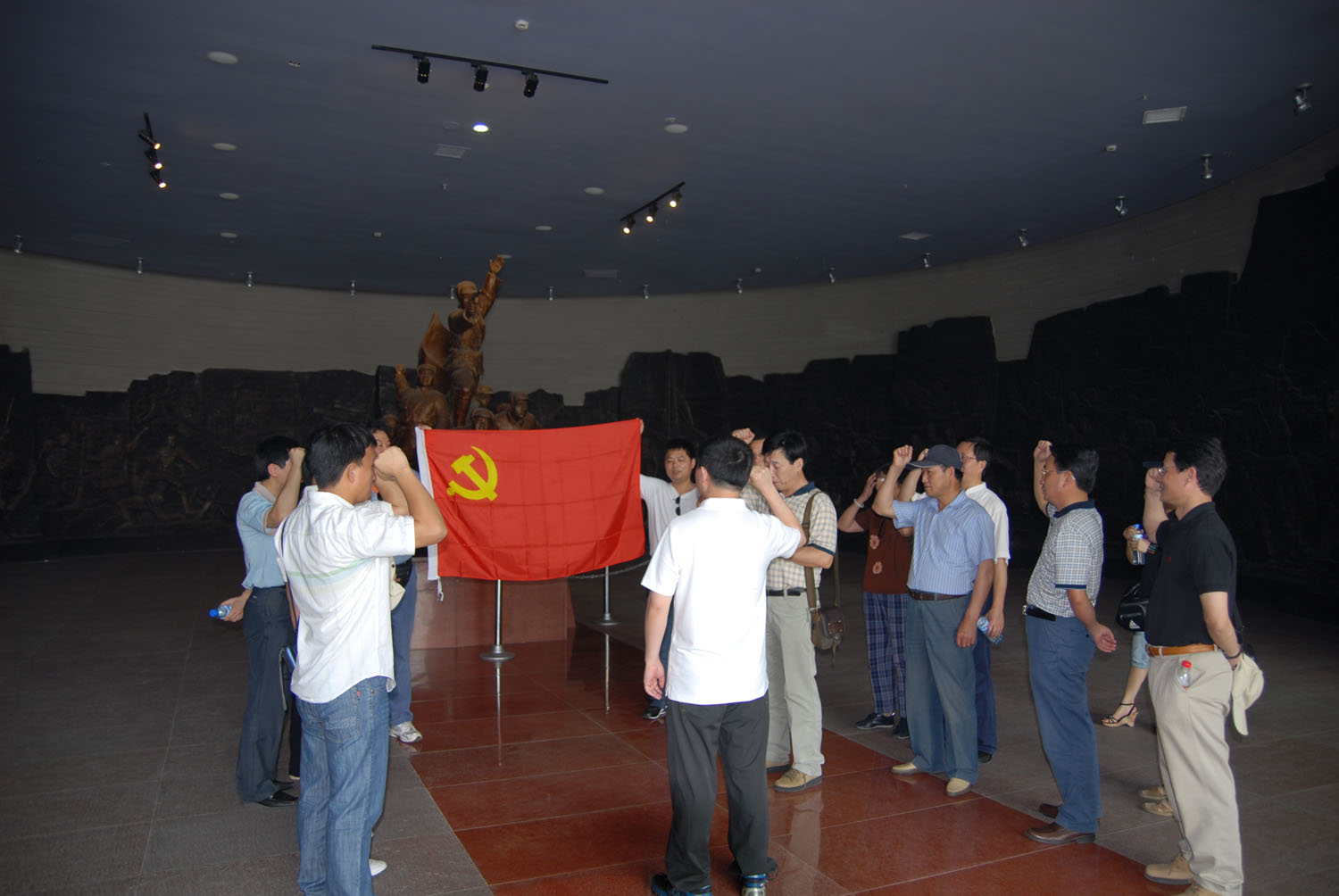 最后在淮海戰(zhàn)役紀(jì)念館前,預(yù)備黨員面隊(duì)著中國(guó)共產(chǎn)黨黨旗,緊握右拳,舉起手臂進(jìn)行了莊嚴(yán)的入黨宣誓,老黨員重溫入黨誓詞。不少同志拍下了許多照片來(lái)紀(jì)念這次有意義的活動(dòng),最后全體黨員同志在淮海戰(zhàn)役紀(jì)念碑前合影以留念。