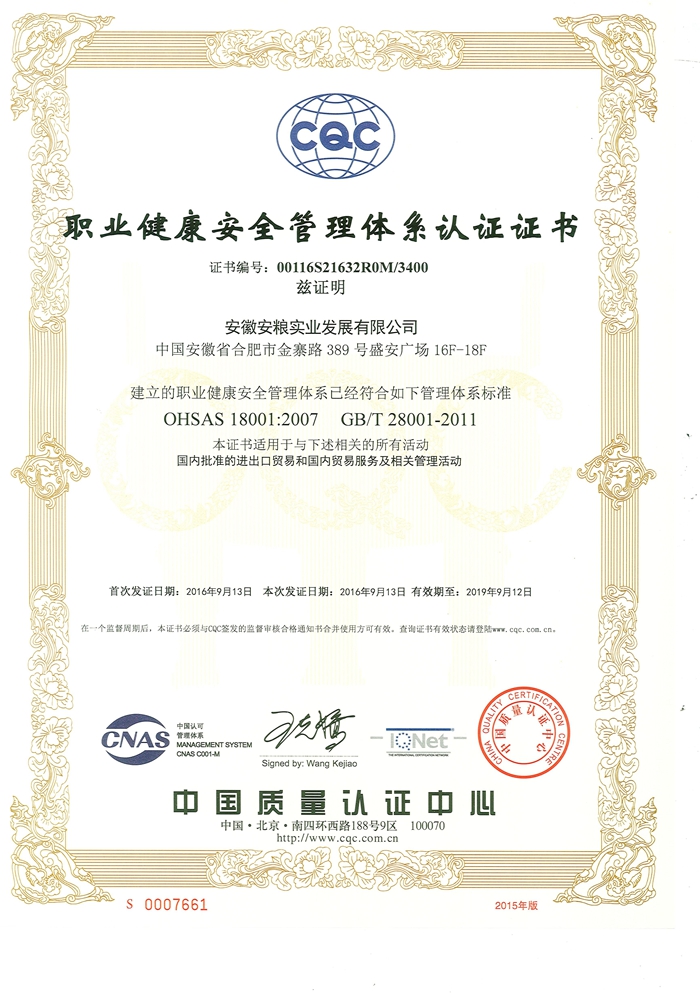 近期,安糧實業(yè)順利通過中國質(zhì)量認(rèn)證中心審核,在ISO9001認(rèn)證的基礎(chǔ)上又取得了ISO14001環(huán)境管理體系和OHSAS18001職業(yè)健康安全管理體系認(rèn)證證書。證書的獲得標(biāo)志著安糧實業(yè)建立了完整國際化管理體系,實現(xiàn)了ISO9001、ISO14001和OHSAS18001三個體系并行運轉(zhuǎn),必將促進(jìn)公司生產(chǎn)經(jīng)營活動更上一個臺階。