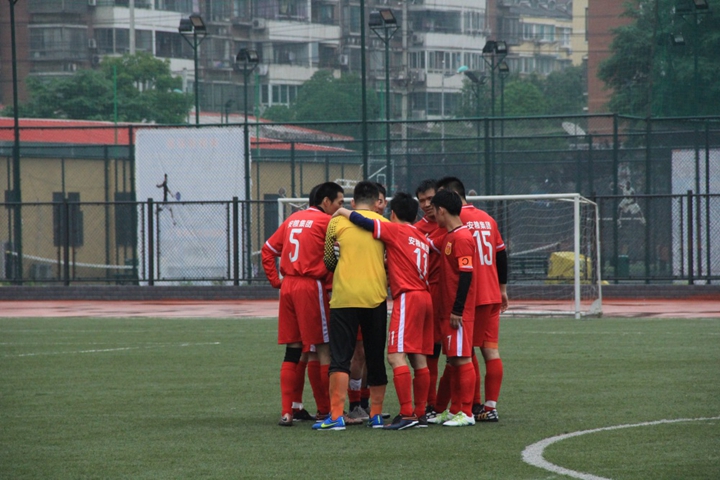 比賽開場不久,惡劣的天氣和球員的狀態(tài)不佳就讓我方遭到了懲罰,對方遠射,門將李釗不敢怠慢,奮力撲出第一點,無奈對方前鋒跟進補射得分。此后我方便開始奮力反撲,但始終不能攻破對手城池。第二節(jié),國貿(mào)聯(lián)隊的經(jīng)驗優(yōu)勢得以凸顯,他們站樁式的防守和不緊不慢的傳控,導(dǎo)致我方很長一段時間無法組織有效的進攻,加上我方隊員急躁的情緒,場面一度失控。休息時間全隊聚集討論,決定奮力一搏,隊長方波帶傷上陣,加強進攻。人員調(diào)整后,我方士氣明顯提升,經(jīng)過幾輪的組織,終于由徐學峰右路突破下底傳中,前點潘永博巧妙一漏,侯立峰左腳冷靜推射破門。一鼓作氣,方波角球精確助攻,對方中后衛(wèi)冒頂,侯立峰后點頭球再下一城。緊接著潘永博突破打門,對方門將脫手,方波跟進冒著左腿再次拉傷的危險,奮力將球打進,3:1鎖定勝局,全體隊員緊緊的擁抱在一起,場下啦啦隊也情緒高漲,擊鼓吶喊為安糧健兒加油。