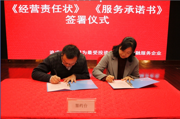 隨后,公司領導與各業(yè)務部門及金財匯頂子公司簽署了《2017年度經(jīng)營目標責任書》,與各中后臺及創(chuàng)新業(yè)務部門簽署了《2017年度服務承諾書》。