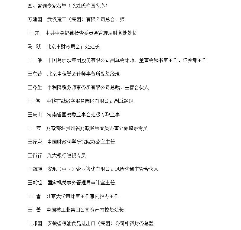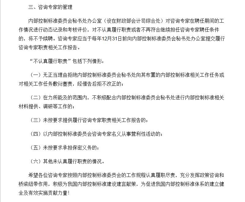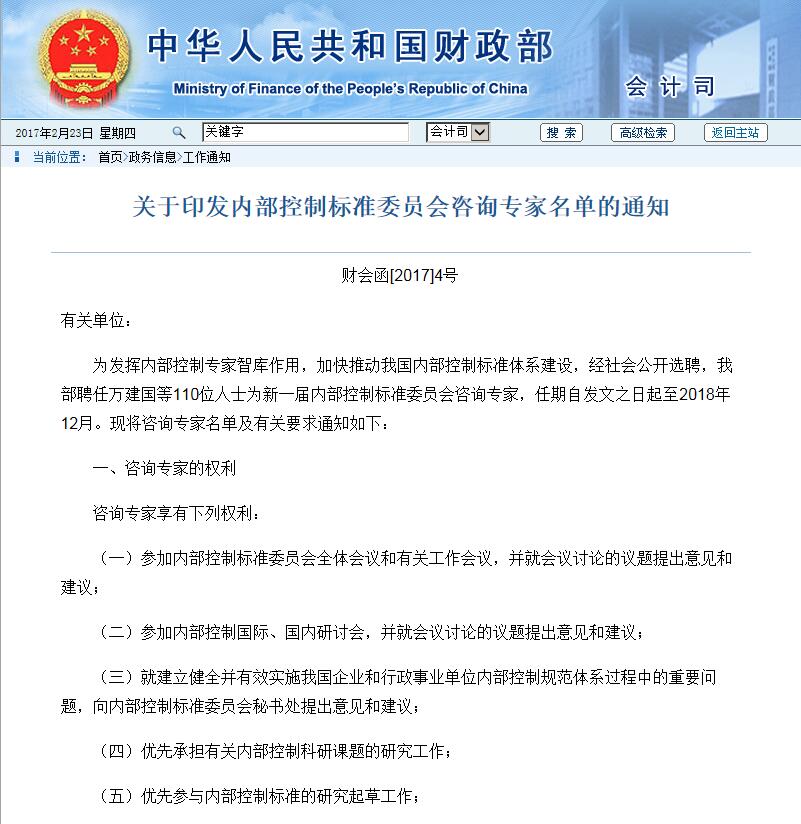 《關(guān)于印發(fā)內(nèi)部控制標(biāo)準(zhǔn)委員會(huì)咨詢專家名單的通知》 http://kjs.mof.gov.cn/zhengwuxinxi/gongzuotongzhi/201702/t20170215_2535525.html