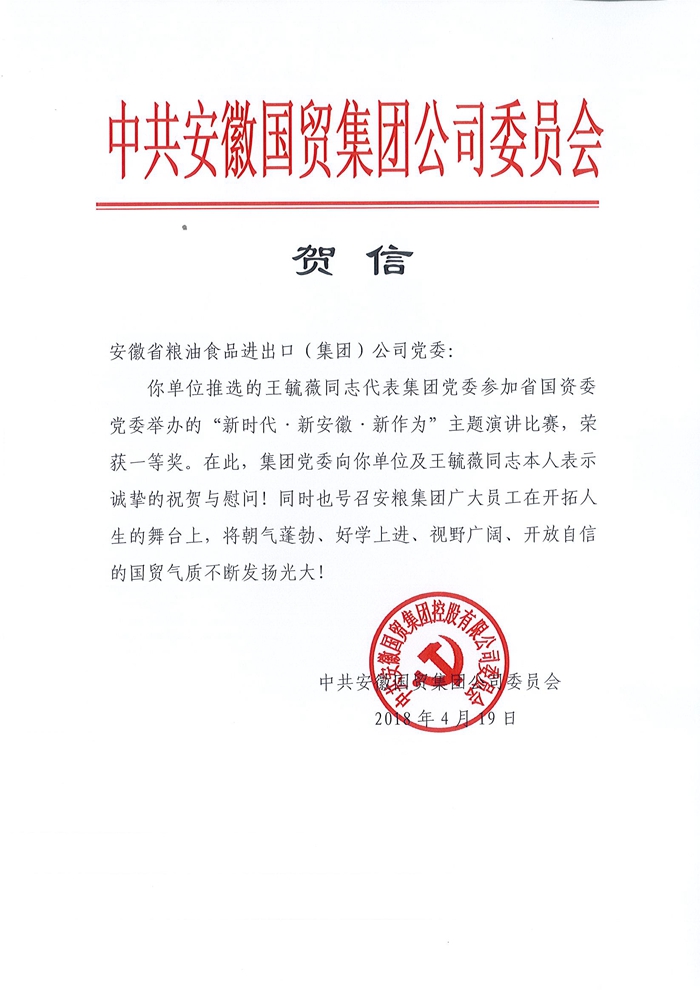 4月19日,安徽國貿(mào)集團(tuán)黨委發(fā)來賀電--在省國資委黨委組織開展的“新時代、新安徽、新作為”主題演講比賽中,我司合肥建工王毓薇代表國貿(mào)集團(tuán)榮獲一等獎!
