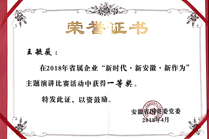 我司員工王毓薇獲國資委黨委 “新時代、新安徽、新作為”主題演講比賽一等獎