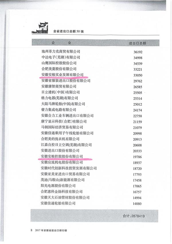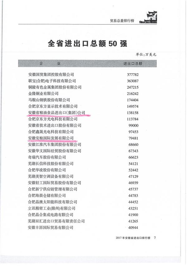 2017年全省進出口總額50強排行榜出爐 安糧集團排名第七位