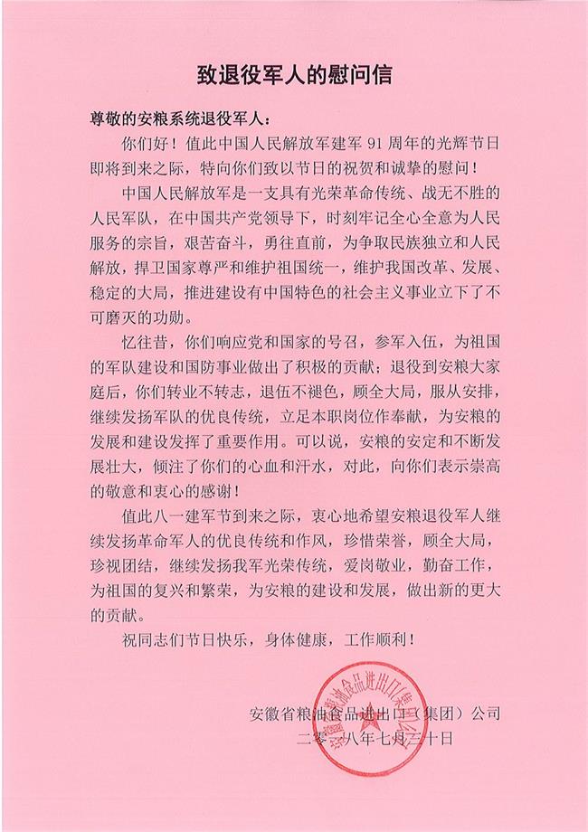 中國(guó)人民解放軍建軍91周年節(jié)日前夕,根據(jù)集團(tuán)黨委的部署,集團(tuán)工會(huì)慰問了安糧系統(tǒng)全體退役軍人,向他們送上節(jié)日的問候和美好的祝愿!