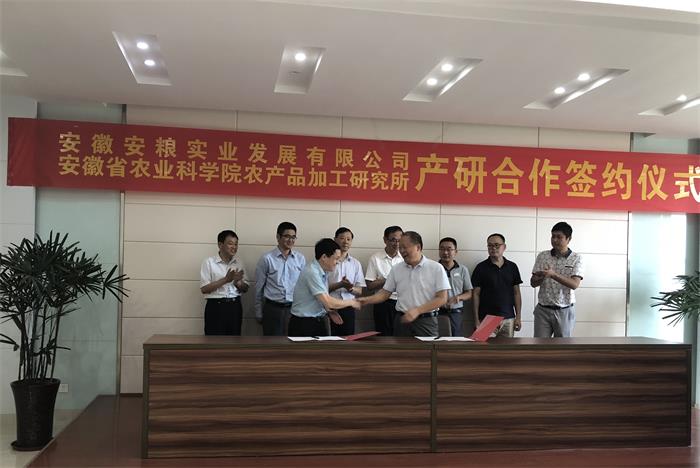 2018年9月19日,安徽省農(nóng)業(yè)科學(xué)院副院長畢小彬、農(nóng)產(chǎn)品加工研究所所長錢坤等一行六人在安糧集團(tuán)黨委委員、監(jiān)事會主席曹訓(xùn)立,安糧實(shí)業(yè)董事長吳國杰的陪同下,來到安糧(巢湖)食品工業(yè)園進(jìn)行調(diào)研考察并簽訂了產(chǎn)研合作戰(zhàn)略協(xié)議。
