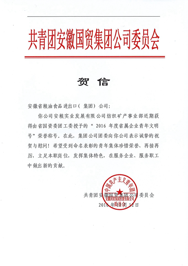 對于小伙伴們來說,家人們做出的犧牲成為了最堅強的后盾,加上公司領(lǐng)導(dǎo)的關(guān)懷和鼓勵,給了整個團隊巨大的拼搏動力,他們擼起袖子加油干,全心全意撲在工作上,最近流行的“996”對他們來說早就是家常便飯,即便是周日也隨時待命。在大家的共同努力下,短短幾年的時間,紡織品的年出口額從金融危機后的一千多萬美元上升到目前將近五千萬美元。2016年,安糧實業(yè)紡織品團隊被省國資委團工委評為“省屬企業(yè)青年文明號”,這也是安糧系統(tǒng)首個獲此殊榮的集體,辛勤的付出終于結(jié)出累累碩果。