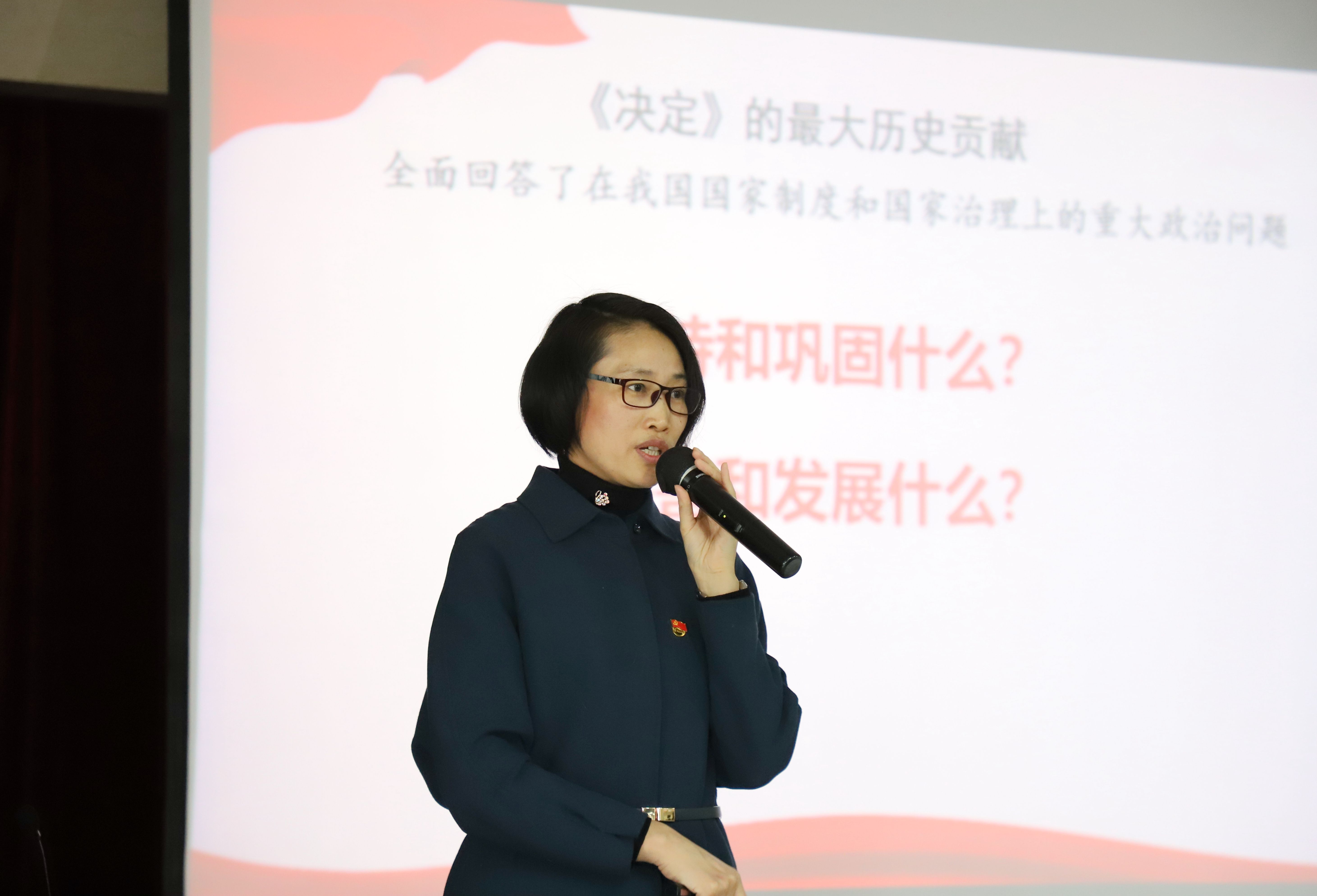 在兩個(gè)多小時(shí)的宣講中,吳教授圍繞“充分認(rèn)識(shí)四中全會(huì)的重大意義”“堅(jiān)定中國特色社會(huì)主義制度自信”“準(zhǔn)確把握總體要求、總體目標(biāo)和重點(diǎn)任務(wù)”“切實(shí)把制度優(yōu)勢(shì)轉(zhuǎn)化為治理效能”四大章節(jié),帶領(lǐng)大家回顧了十八大以來歷次中央全會(huì)的主題與鮮明特點(diǎn),用十三個(gè)方面的“顯著優(yōu)勢(shì)”、十三個(gè)“堅(jiān)持與完善”、三個(gè)“突出”、四大“亮點(diǎn)”,深刻闡釋了全會(huì)召開的重大意義,深入闡述了中國特色社會(huì)主義制度和國家治理體系的優(yōu)勢(shì)和實(shí)踐成果,以及《決定》的重大歷史貢獻(xiàn)。