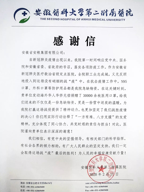 在現(xiàn)場(chǎng)捐贈(zèng)3萬(wàn)只口罩給安醫(yī)二附院后,第二天上午,國(guó)貿(mào)集團(tuán)向省紅十字會(huì)捐贈(zèng)了10萬(wàn)只口罩,有力地支援了安徽的防控戰(zhàn)“疫”。剩余的口罩也及時(shí)發(fā)放到國(guó)貿(mào)集團(tuán)和安糧集團(tuán)所屬企業(yè),為各家企業(yè)的復(fù)工復(fù)產(chǎn)提供了有力保障。