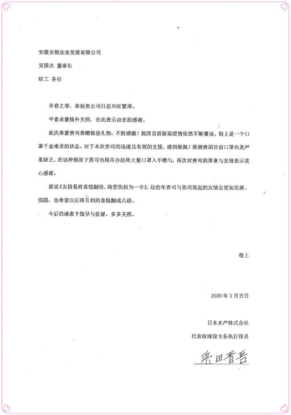 近日,日本水產(chǎn)株式會(huì)社的感謝信從東京寄到安糧實(shí)業(yè),用以表達(dá)對安糧實(shí)業(yè)捐助其10000只口罩的衷心感謝。