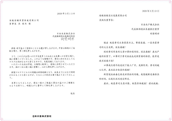 日本水產(chǎn)株式會(huì)社向安糧實(shí)業(yè)寄來捐贈(zèng)口罩感謝信