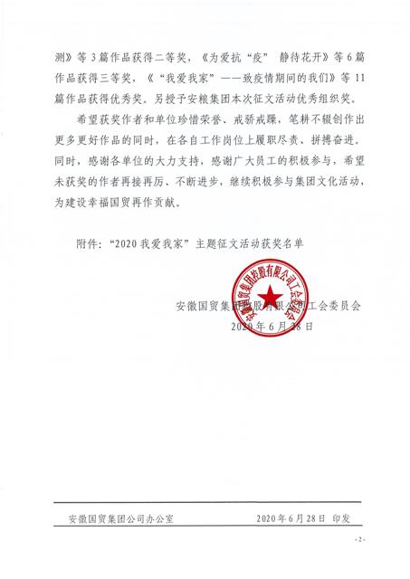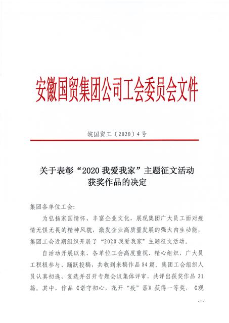 為弘揚(yáng)家國情懷、豐富企業(yè)文化,國貿(mào)集團(tuán)工會組織開展了“2020我愛我家”主題征文活動。安糧集團(tuán)工會積極參與,最終斬獲多項獎項,以最佳的姿態(tài)畫上圓滿的句號。