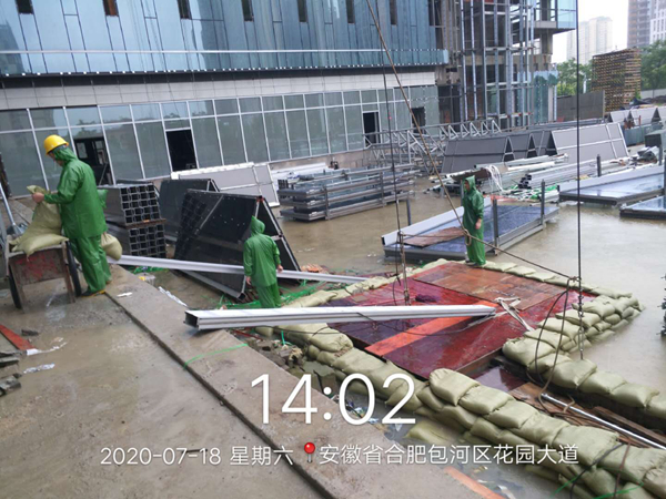 針對入梅以來嚴(yán)峻的防汛形勢,已交付及在運營項目積極協(xié)調(diào)物業(yè)公司,共同迎戰(zhàn)強降水天氣。位于合作化路和南二環(huán)交口的安糧國貿(mào)中心是此次防汛形勢較嚴(yán)峻的重點項目,特別是降雨量突破合肥市歷史極值的7月18至19日,積水內(nèi)澇直接影響到地下室的安全。險情出現(xiàn)時,一線人員及時匯報,各崗位人員在半個小時內(nèi)到崗參與排險工作。項目部對地庫出入口等易形成倒灌水的危險區(qū)域安排工作人員堆砌沙袋,打開集水井蓋板,保證積水最大流量的排放。同時配合唯品會工作人員啟動區(qū)域排水泵,對易積水難排水區(qū)域進(jìn)行再清理再疏通,隨著南二環(huán)和合作化路積水水位逐漸下降,安糧國貿(mào)中心順利通過了此次防汛考驗。