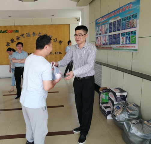 8月12日上午,安糧集團(tuán)副總裁、安糧實(shí)業(yè)董事長吳國杰,赴安可福食品有限公司開展調(diào)研工作并代表安糧集團(tuán)工會向一線人員工發(fā)放了礦泉水、仁丹、毛巾等防暑降溫用品,慰問奮戰(zhàn)在高溫生產(chǎn)一線的員工,叮囑大家在疫情期間尤其要注意做好防暑降溫,把身體健康放在第一位。
