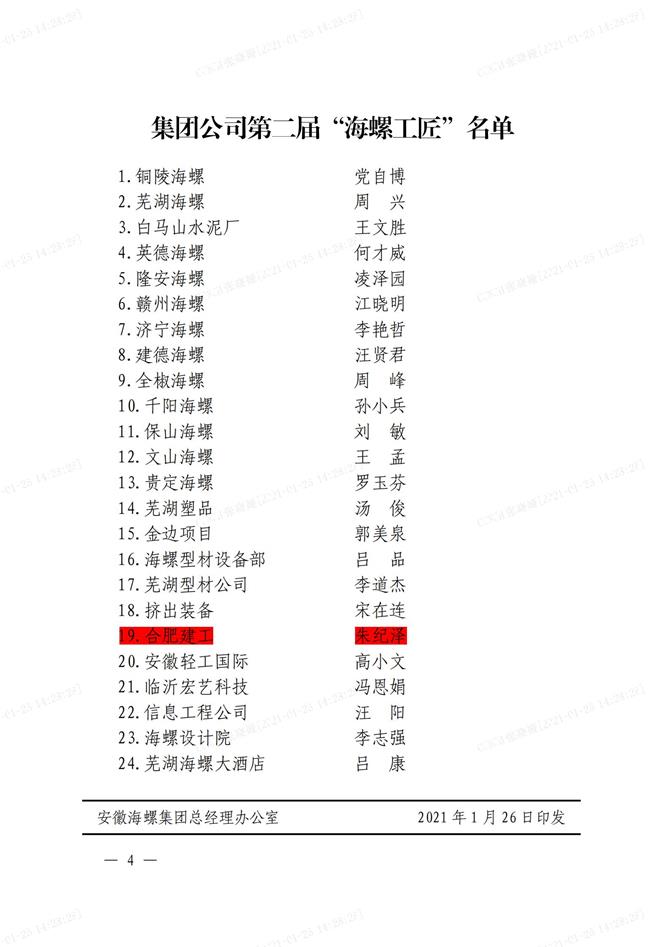 2020年126日,海螺集團(tuán)召開2021年工作會議暨第二屆“海螺工匠”表彰大會,授予24名職工“海螺工匠”的光榮稱號。合肥建工朱紀(jì)澤名列其中,成為安糧集團(tuán)系統(tǒng)內(nèi)首位獲此殊榮的員工。
