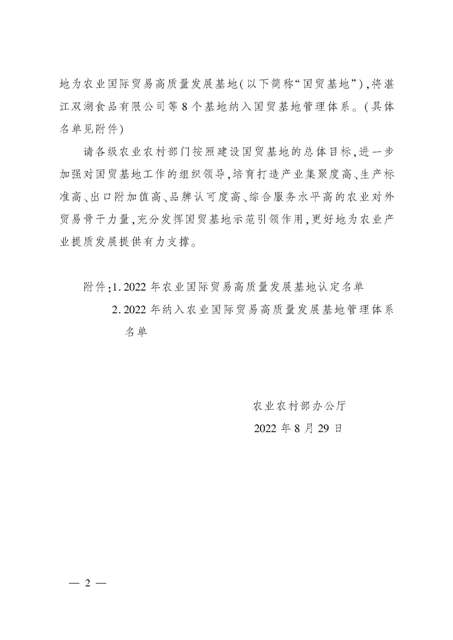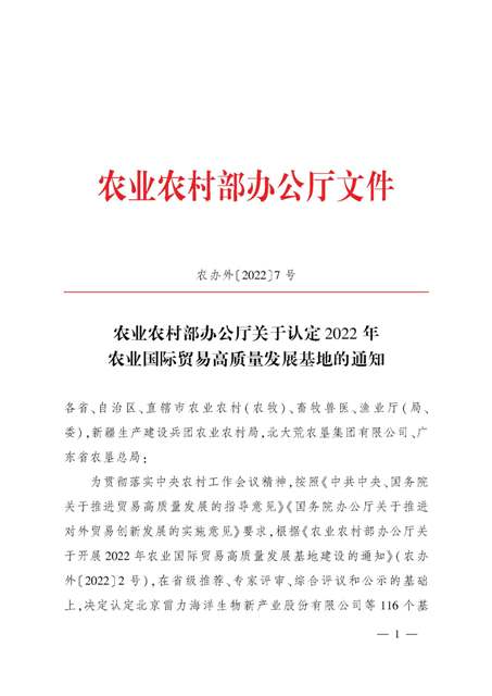 日前,農(nóng)業(yè)農(nóng)村部發(fā)布了《關(guān)于認(rèn)定2022年農(nóng)業(yè)國際貿(mào)易高質(zhì)量發(fā)展基地的通知》,經(jīng)省級推薦、專家評審、綜合評議和公示,認(rèn)定安徽安糧實(shí)業(yè)發(fā)展有限公司等116個(gè)基地為2022年農(nóng)業(yè)國際貿(mào)易高質(zhì)量發(fā)展基地。