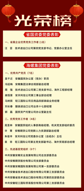 近日,省國資委黨委、海螺集團(tuán)黨委分別開展了省屬企業(yè)和集團(tuán)優(yōu)秀共產(chǎn)黨員、優(yōu)秀黨務(wù)工作者、先進(jìn)基層黨組織表彰,安徽國貿(mào)所屬技術(shù)進(jìn)出口公司汪蕓同志榮獲省屬企業(yè)優(yōu)秀黨務(wù)工作者稱號,吳千遷等7名同志榮獲集團(tuán)優(yōu)秀共產(chǎn)黨員稱號,晁圣林等4名同志榮獲集團(tuán)優(yōu)秀黨務(wù)工作者稱號,安糧實業(yè)公司黨總支等6個基層黨組織榮獲集團(tuán)先進(jìn)基層黨組織稱號。