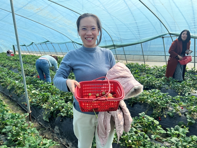 連片的草莓棚里,顆顆草莓飽滿、香甜,透著勃勃生機(jī),甜蜜的香氣撲鼻而來。大家按捺不住興奮的心情,提著小框穿梭在草莓田間精挑細(xì)選,或駐足合影、或互相幫助,不一會(huì)兒,筐子里已是碩果累累,收獲的喜悅溢于言表。采摘的同時(shí),果園負(fù)責(zé)人還為大家介紹了草莓品種、草莓的栽培方法和現(xiàn)代農(nóng)業(yè)發(fā)展?fàn)顩r。