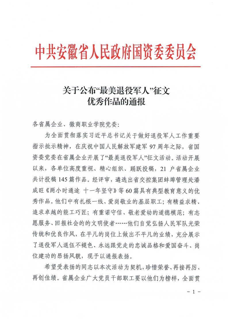 近日,安徽省國資委黨委通報了“最美退役軍人”征文活動優(yōu)秀作品名單。安糧集團選送的兩篇作品《退役不改本色 續(xù)寫奮斗篇章》《揮別軍涯 續(xù)寫華章》均獲評“優(yōu)秀作品”。